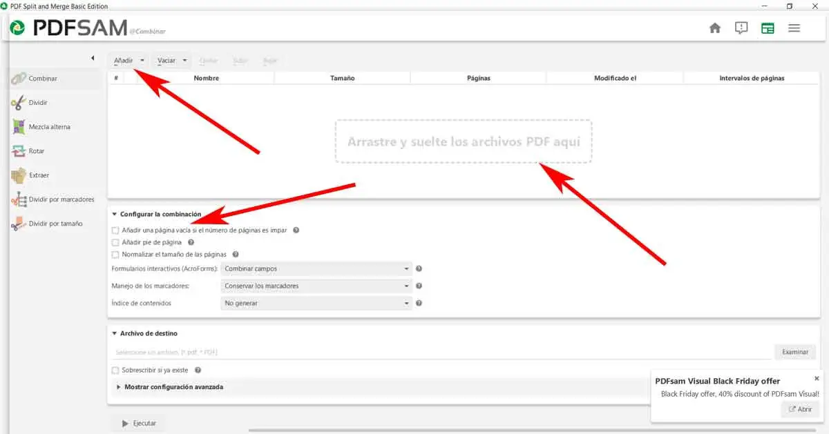 Par exemple, lors de la division d’un PDF, nous pouvons spécifier si nous voulons séparer uniquement après les pages paires ou impaires, ou lors de la combinaison, nous pouvons ajouter des pages vierges ou générer une table des matières . En même temps, nous allons voir un bouton Ajouter pour pouvoir charger les fichiers, alors que dans certains modes, il suffit de les faire glisser.