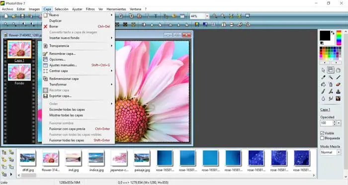 Nous pouvons également gérer différents types de couches qui sont très bien implémentées. D’une part, nous aurons un type de bitmap que nous pouvons utiliser pour les opérations de copier-coller. También cuenta con capas de tipo de texto dinámico que se pueden modificar en cualquier momento, capas de configuración que proporciona diferentes ajustes de gamma, contracte o tono en tiempo real, así como capas de color, que se usan para proporcionar efectos de transparencias en tiempo réel. Avec l’explorateur de fichiers intégré, nous pouvons trouver rapidement toutes les photos que nous voulons manipuler.