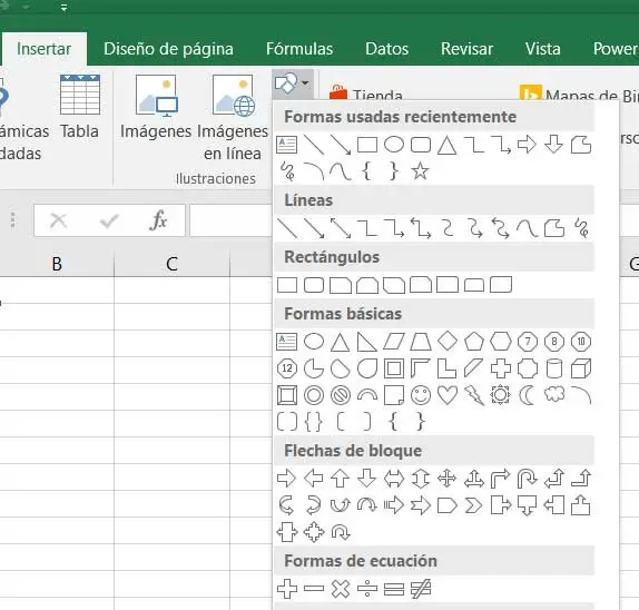 Pour ce faire, nous devons ouvrir Excel et cliquer sur l’onglet Insertion, où nous verrons les boutons Images ou Formes dans la section Illustrations. Par conséquent, en cliquant sur Formes, un menu déroulant avec plusieurs options apparaît, où nous marquons celle qui nous intéresse le plus.