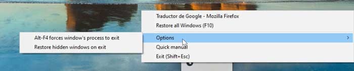 À partir du bouton Réduire dans le bac, nous trouverons également la fonction Options . De là, nous pouvons forcer l’application à quitter pour quitter ou en utilisant le raccourci clavier ALT + F4 . Nous aurons également la possibilité de restaurer toutes les fenêtres cachées, en cliquant sur «Restaurer les fenêtres cachées à la sortie». Avec l’option «Manuel rapide», une fenêtre apparaîtra d’où elle nous rappellera les raccourcis clavier pour minimiser et restaurer les fenêtres. Nous aurons également une adresse e-mail pour contacter le développeur en cas de problème.