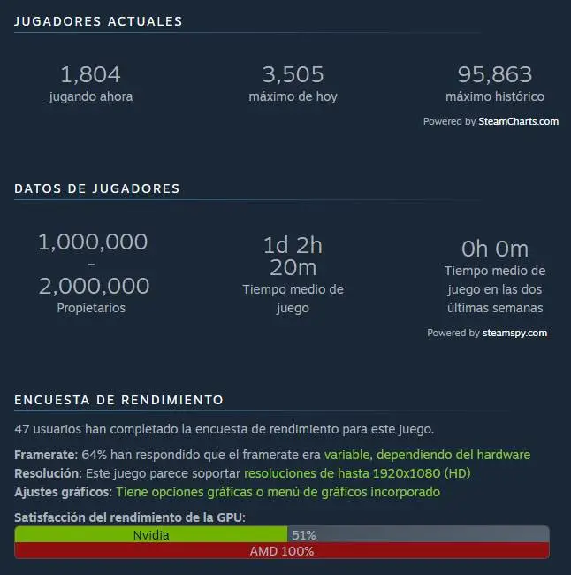En plus de la description du jeu, nous pouvons trouver des informations sur les joueurs actuels, les données des joueurs et même une comparaison des performances selon les utilisateurs de NVIDIA et AMD.