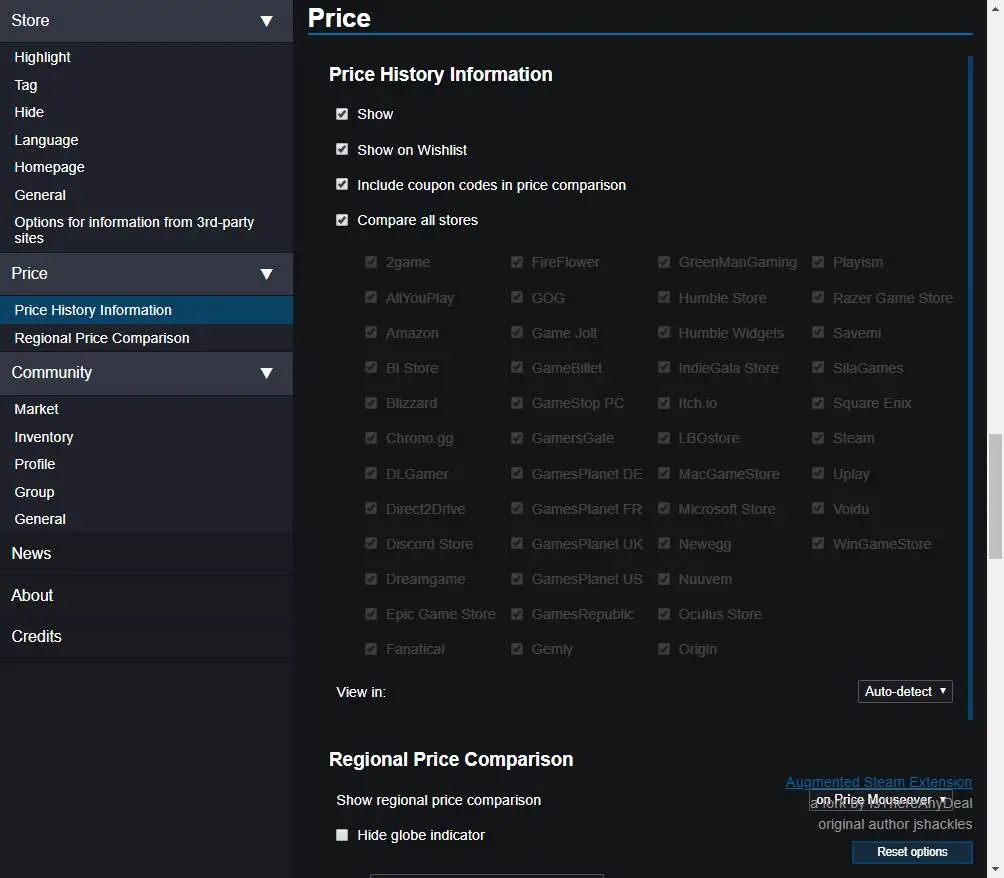 La section «Prix» nous permet de configurer différentes options liées au prix des jeux. Par exemple, on peut ajouter le prix d’autres magasins au sein de Steam pour voir s’il est moins cher de l’acheter à l’extérieur, ou une comparaison de prix selon les différentes régions.