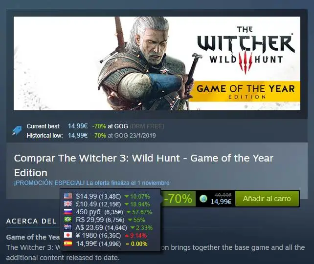 De plus, si nous plaçons la souris sur l’icône qui apparaît à côté du prix, nous pouvons voir ce que cela coûte dans d’autres régions de Steam. Par exemple, si nous achetons ce jeu en Russie ou au Brésil, il coûtera la moitié du prix.