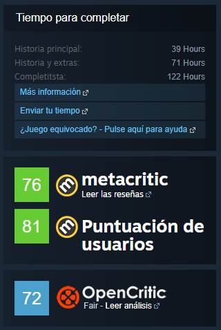 Dans la colonne de droite, nous pouvons également trouver des informations intéressantes. Par exemple, on peut voir la cote de Metacritic et OpenCritic, ainsi que la durée du jeu grâce à HowLongToBeat.