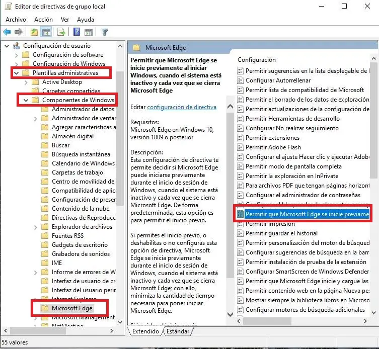 Une fois à l’intérieur, nous allons dans «Modèles d’administration> Composants Windows> Microsoft Edge» et nous chercherons dans la configuration une règle appelée »Autoriser Microsoft Edge à démarrer précédemment …»