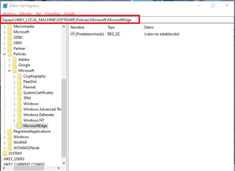 Chemin: «Ordinateur \ HKEY_LOCAL_MACHINE \ SOFTWARE \ Policies \ Microsoft \ MicrosoftEdge»