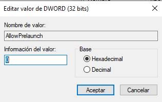 Après cela, nous créerons dans le dossier MicrosoftEdge une «nouvelle valeur DWORD (32 bits)» avec le nom «AllowPrelaunch» (sans guillemets) et nous introduirons la valeur 0.