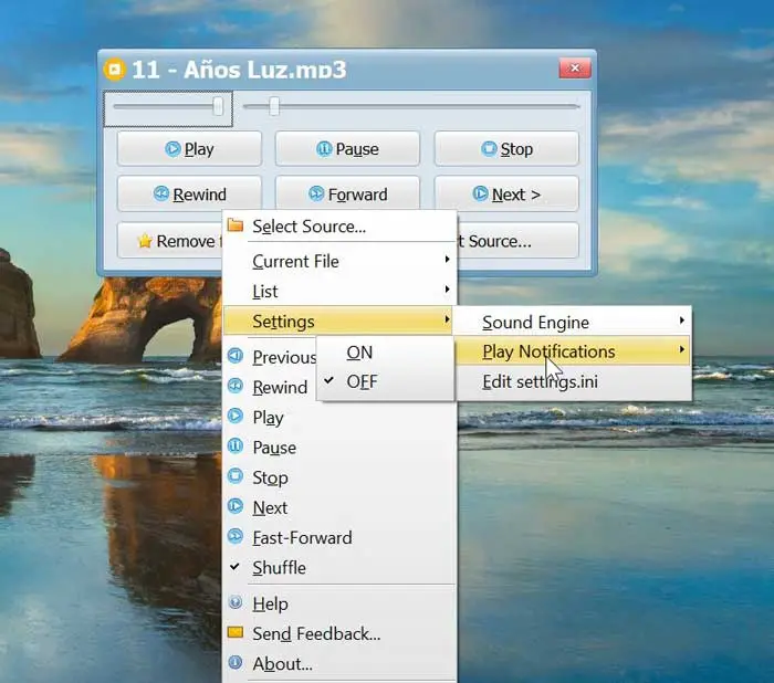 Dans le dossier Paramètres , nous trouvons les options pour désactiver les notifications des chansons, ce qui est fortement recommandé car elles sont généralement un peu ennuyeuses si nous travaillons avec l’ordinateur. Une fois activé, une notification apparaîtra dans la partie inférieure droite de notre bureau à chaque fois que la chanson est modifiée. Pour le désactiver, il suffit d’aller dans Paramètres, puis de survoler Play Notifications et de sélectionner OFF . De cette façon, nous ne recevrons aucune notification à chaque fois que vous changez de chanson.