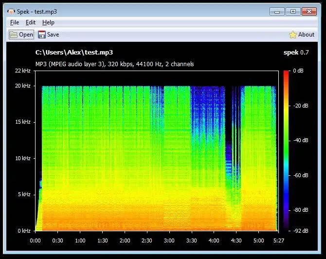 Spek n’est pas un programme d’édition en tant que tel, mais son but est de nous aider à analyser les fichiers audio avant de commencer à les éditer pour savoir comment les améliorer. Ce programme nous permet d’analyser n’importe quel fichier MP3 pour afficher son spectrogramme, étant l’un des plus complets pour cette tâche.