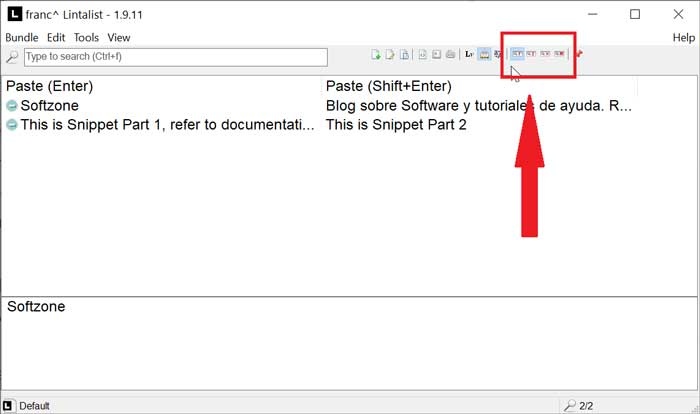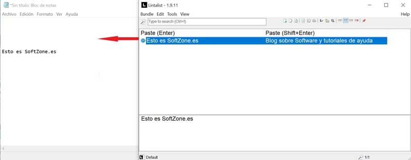 Para pegar un recorte, debemos pulsar el Bloqueo de mayúsculas para abrir la ventana de búsqueda y buscar una de las palabras del fragmento, por ejemplo, SoftZone, y nos mostrará los fragmentos para mostrar todos los que contienen la palabra clave. Pulsamos la tecla Intro para pegar el fragmento resaltado en la ventana actual, por ejemplo, el Bloc de notas.