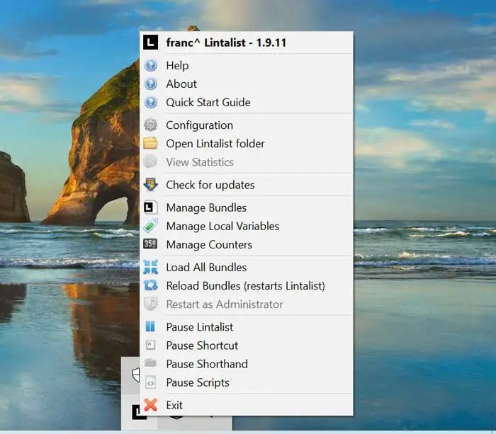 Lintalist es un programa que no necesitamos tener la ventana abierta para poder ser utilizado ya que se ejecuta permanentemente en segundo plano. De hecho, si miramos en la barra de tareas encontraremos su logo, que si pinchamos sobre él nos aparecerá un menú desplegable con acceso directo a varias de sus funciones. Desde aquí podremos administrar paquetes, variables locales o contadores. También podremos acceder a su carpeta de Configuración, cargar o reiniciar todos los paquetes, o incluso acceder a una guía de inicio rápido.