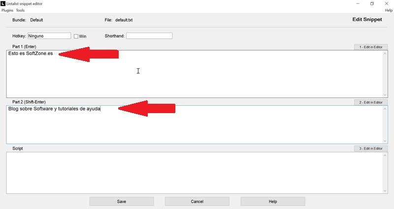 Para crear un recorte podemos usar el menú de edición o bien pulsar la tecla F7. De esa forma nos aparecerá el editor de recortes, que podemos usar para añadir nuevos fragmentos o editar los ya existentes. Ahora introducimos el contenido del texto en la parte 1, por ejemplo: «Esto es SoftZone.es». En la parte 2 introducimos el contenido, por ejemplo «Blog sobre Software y tutoriales de ayuda».