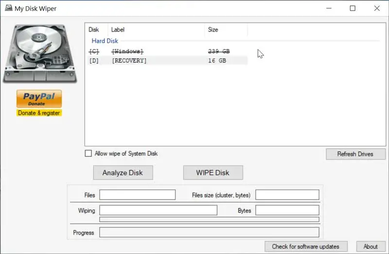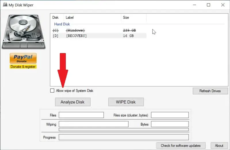 Sin embargo, la aplicación también con una opción incorporada que permite anular la imposibilidad de borrar la unidad desde la cual estamos ejecutando My Disk Wiper. Para ello deberemos de marcar la casilla «Allow wipe of System disk». Esto puede resultar interesante en caso de que existan varios sistemas operativos instalados en nuestro ordenador y necesitemos borrar la unidad desde donde se ejecuta el programa.