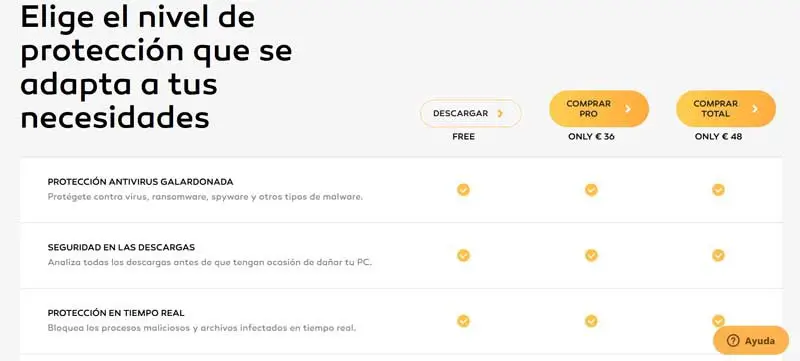 - Avast Free Antivirus : cet antivirus bien connu nous offre une protection contre les virus entièrement gratuite et dans le cloud, nous protégeant en temps réel en analysant les fichiers inconnus avant de pouvoir les utiliser. Nous pouvons le télécharger à partir de ce lien . Il dispose également d’une version Premium que nous pouvons acheter à partir de 69,99 euros par an.