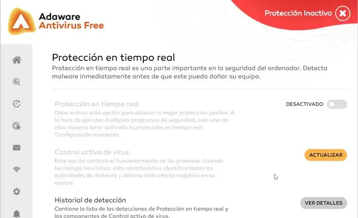 En activant cette option, nous aurons une protection en temps réel qui nous permettra de détecter tous les types de logiciels malveillants avant qu’ils ne puissent endommager notre ordinateur. Nous avons également un pilote de virus qui sera chargé d’identifier toutes les activités des malwares, en arrêtant tous leurs effets négatifs qui peuvent affecter notre ordinateur. Enfin, dans l’historique de détection, nous trouverons une liste avec tous les arrêts des composants de protection en temps réel et de contrôle actif des virus.
