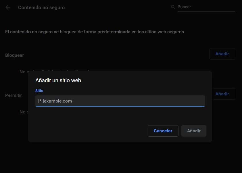 Pour ce faire, nous devons revenir à l’option de menu mentionnée ci-dessus, mais dans ce cas précis, nous localisons la section appelée Configuration du site Web. Ensuite, sous Contenu non sécurisé, nous avons la possibilité de spécifier certaines pages Web qui seront bloquées dans le programme . De cette façon, lorsque désormais nous essayons d’y accéder, nous ne pourrons pas le faire.