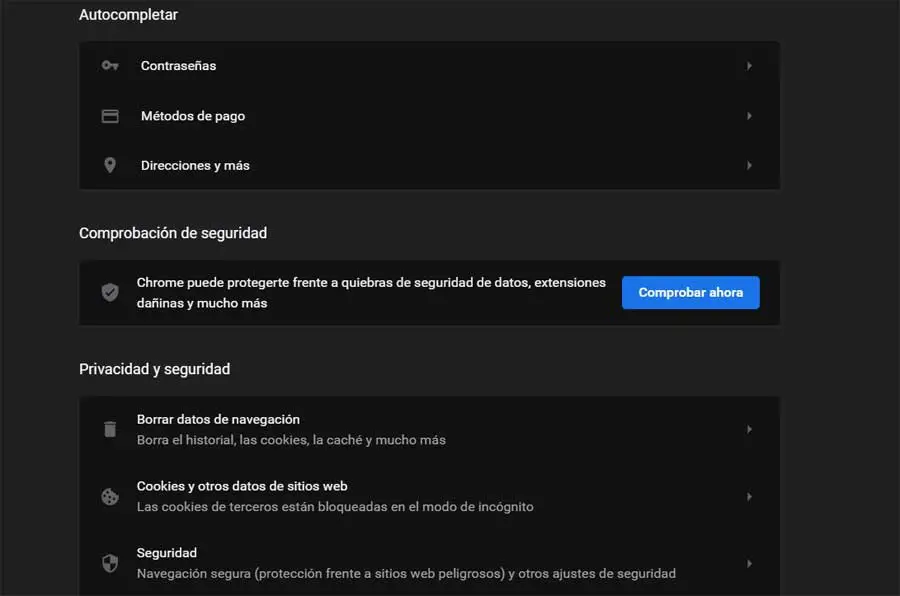 Si l’on prend en compte l’objectif pour lequel ces programmes ont été créés, la sécurité qu’ils peuvent offrir à leurs utilisateurs est un élément clé. Pour cela, des solutions comme le Chrome précité nous présentent un bon nombre de fonctions de ce type. On peut les retrouver en cliquant sur le bouton représenté par trois points verticaux dans le coin supérieur droit. Ensuite, nous cliquons sur Paramètres , et dans la section Confidentialité et sécurité, nous trouvons un bon nombre de paramètres.