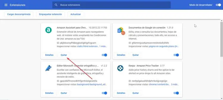 En plus des extensions de navigateur, il comprend également des scripts qui s’exécutent lorsque nous chargeons votre site Web pour nous fournir ses fonctionnalités. Si nous exécutons des scripts supplémentaires, cela entraîne une consommation de processeur plus élevée et donc une consommation de batterie plus élevée. C’est pourquoi il est pratique de désinstaller les extensions qui consomment le plus et que nous utilisons moins pour obtenir un navigateur plus léger. Pour cela, il faut cliquer sur le bouton de menu, puis sur «Plus d’outils» et cliquer sur «Extensions». De là, nous pouvons désinstaller toutes ces extensions inutiles.