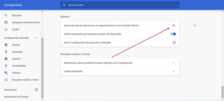 Une autre option est d’empêcher Chrome de vider la batterie de notre ordinateur portable est de s’assurer que nous le fermons complètement. Et, par défaut, le navigateur continue de fonctionner en arrière-plan , même après sa fermeture. Avec cela, Chrome permet non seulement à certaines fonctions du navigateur de s’exécuter en arrière-plan, mais leur permet également de se rouvrir plus rapidement, car ces ressources sont déjà en cours d’exécution. Cependant, avec cela, Chrome continuera également à avoir un impact significatif sur la batterie de notre ordinateur portable pendant qu’il fonctionne en arrière-plan.