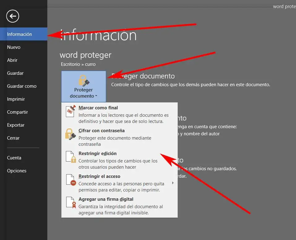 À ce moment-là, nous allons trouver plusieurs gros boutons, mais celui qui nous intéresse dans ce cas précis est celui appelé Protect document . C’est là que nous trouvons une série d’options parmi lesquelles choisir afin d’opter pour la méthode de protection la plus appropriée dans chaque cas.
