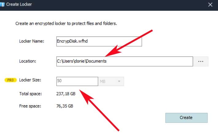 Ensuite, après avoir cliqué sur Créer, nous devrons créer un nouvel espace de cryptage avec les éléments que nous sélectionnons dans le champ Emplacement. Il est clair que pour éliminer ce cryptage à l’avenir, nous devrons utiliser le mot de passe que nous avons défini au début, lors de l’installation du programme.