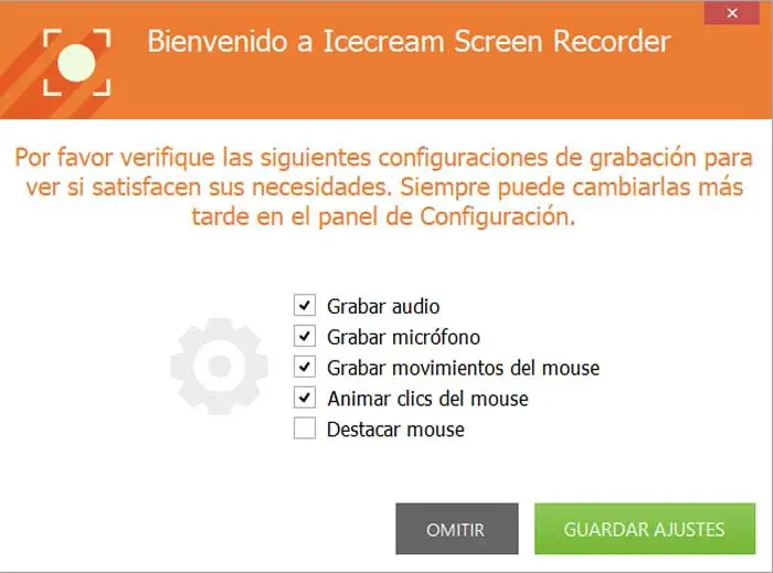 Une fois que nous exécutons l’application pour la première fois, une fenêtre apparaît dans laquelle nous devons vérifier les conditions d’enregistrement , et que nous pouvons modifier ultérieurement à partir du menu Paramètres. De cette façon, nous pouvons marquer si nous voulons que l’enregistrement audio, le microphone, l’enregistrement des mouvements de la souris soient actifs, animer les animations de la souris et mettre en évidence la souris. Nous sélectionnons ceux dont nous avons besoin et cliquons sur «Enregistrer les paramètres». Si nous ne voulons pas le personnaliser, cliquez simplement sur «Ignorer».