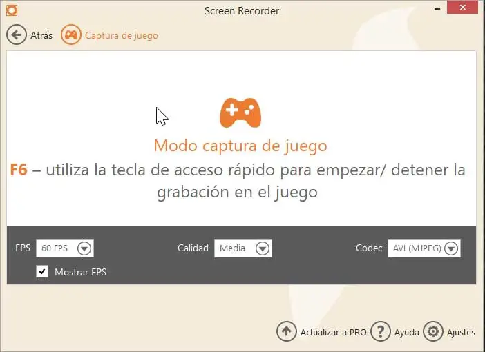 Icecream Screen Recorder nous permet également de capturer des jeux à partir de son onglet correspondant. De là, nous pouvons utiliser la touche de raccourci F6 pour démarrer ou arrêter l’enregistrement du jeu. Nous pouvons personnaliser l’enregistrement FPS de 25 à 60 fps, ainsi que la qualité (haute, moyenne ou basse) et le codec utilisé (AVI ou MP4). Nous pouvons également marquer si nous voulons que le FPS soit affiché pendant l’enregistrement du jeu.