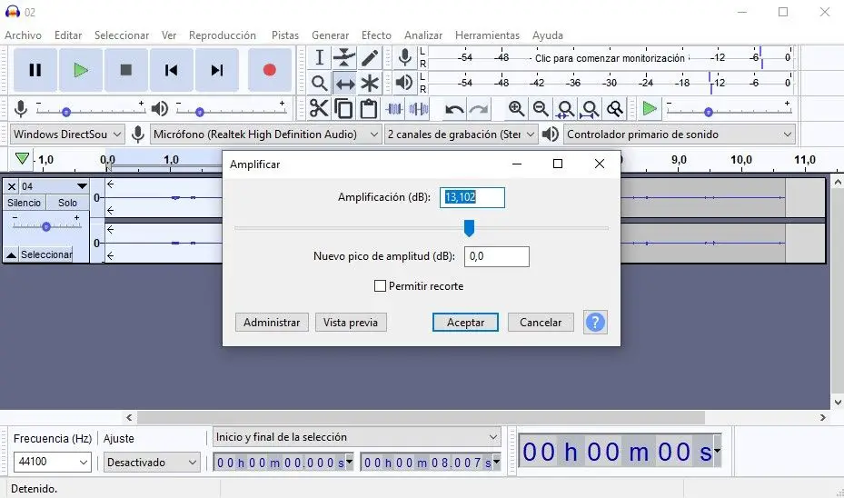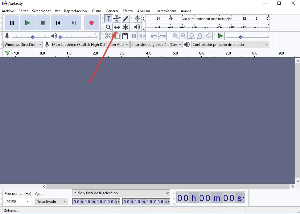 Une fois le changement de configuration de notre ordinateur effectué, nous démarrons Audacity pour terminer le processus. Il y a trois variables que nous devons changer dans l’interface. Dans le premier menu déroulant, nous choisirons «Windows DirectSound», dans le «Mix stéréo» que nous avons activé à l’étape précédente et, enfin, «2 canaux d’enregistrement».