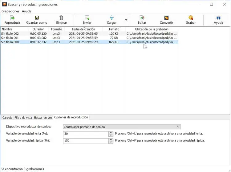 Dans la partie inférieure des «Afficher les filtres», nous aurons la possibilité de visionner des enregistrements avec une certaine durée ou de filtrer par date . Il a également la possibilité de rechercher dans la voix et de pouvoir rechercher des mots-clés ou par reconnaissance vocale. Dans les options de lecture, nous pouvons sélectionner le périphérique de reproduction sonore et choisir la variable de vitesse lente et rapide