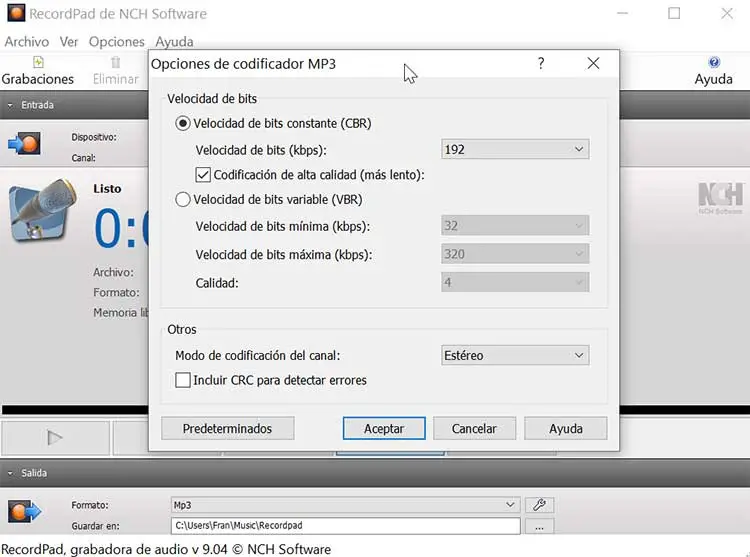 De cette façon, si nous choisissons MP3 comme format de sortie, nous pouvons configurer le débit binaire constant (CBR) de 8 à 320 bits (kbps) ou des bits variables, ainsi que le mode de codage du canal (Estero, Mono, force, Joint) . Pour démarrer notre enregistrement, appuyez simplement sur le bouton rouge (Rec) ou appuyez sur F5. Pendant l’enregistrement, nous pouvons le mettre en pause, l’arrêter ou répéter l’enregistrement. Une fois terminé, nous pouvons accéder au fichier en accédant au chemin que nous avons établi. Cliquez également sur l’icône Enregistrements en haut, à partir de laquelle nous pouvons rechercher et lire des enregistrements.