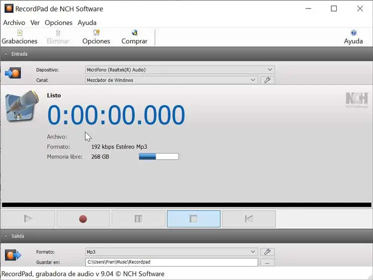 RecordPad est un enregistreur vocal qui appartient à NCH Software , et est idéal pour un usage personnel et professionnel. Avec lui, nous pouvons enregistrer du son, de la voix, des notes, de la musique ou tout autre type d’audio. Ce logiciel d’enregistrement audio nous permet d’enregistrer à partir d’un microphone, d’un lecteur de CD, d’une entrée en ligne ou d’un autre élément avec lequel écouter depuis l’ordinateur. Les enregistrements que nous obtenons peuvent être sauvegardés sur notre disque dur au format WAV, MP3 ou FLAC. En option, nous pouvons envoyer des enregistrements par e-mail ou les télécharger sur un serveur FTP.