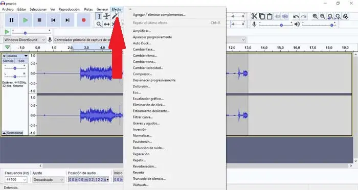 Si nous voulons faire des ajustements plus avancés que ceux proposés par la fonction Edit, nous pouvons choisir d’ajouter des effets . Cette fonctionnalité est également en haut du menu. Ici, nous trouverons une sélection d’options avec lesquelles nous pouvons ajouter des effets à notre son tels que: changement de vitesse, réduction du bruit, inverse, graves et aigus, distorsion, égaliseur graphique, répétition, réparation, compresseur, écho, entre autres .