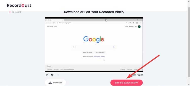 Une fois que nous avons terminé notre enregistrement, nous pouvons voir le résultat complet à partir de la même page. Nous avons également un bouton «Télécharger» qui nous permet de télécharger notre vidéo au format .webm (WebM Media File). Juste à côté, nous trouvons le bouton «Modifier et exporter en MP4», à travers lequel nous pouvons continuer à éditer notre vidéo avec la possibilité de l’exporter au format MP4.