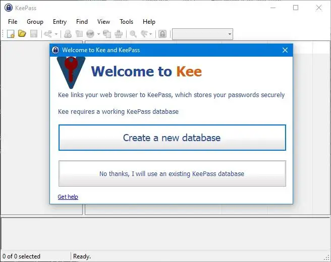 Lorsque Kee est déjà connecté à KeePass, nous pourrons voir une fenêtre qui nous dira si nous voulons créer une nouvelle base de données, ou utiliser une base de données existante.