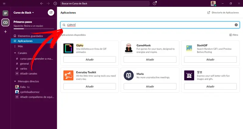 Pour que vous puissiez envoyer des GIF à vos collègues, la première chose à faire est de lier Slack à une plate-forme qui convertit les vidéos en ces types d’animations. Par conséquent, vous devrez vous rendre dans l’espace de travail et rechercher une barre de gauche qui apparaît sur votre écran avec l’option Plus .