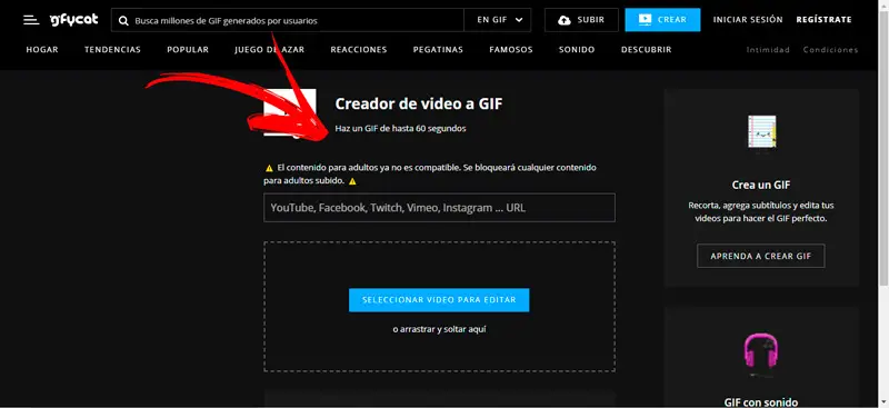 Dans Gfycat, vous trouverez des millions de GIF générés par les mêmes utilisateurs , qui sont répartis dans différentes catégories qui vous aideront à trouver rapidement celui qui vous convient le mieux. Mais ce n’est pas tout ce que vous pouvez faire dans Gfycat, vous pourrez également créer votre propre GIF en ligne . Pour ce faire, vous devez vous inscrire gratuitement sur la plateforme puis télécharger la vidéo en appuyant simplement sur le bouton Créer, situé dans la partie supérieure de l’écran.