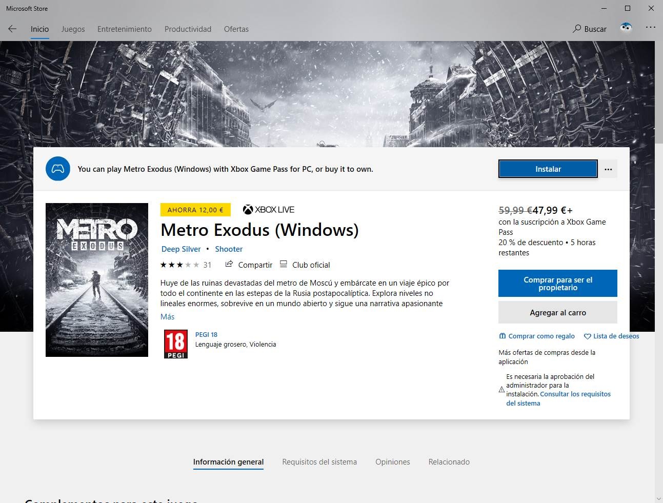 Si nous entrons dans le fichier du jeu, nous pouvons voir plusieurs options. Par exemple, nous pouvons voir un bouton vert qui nous permettra d’installer le jeu sans avoir à le payer, ou différentes options d’achat au cas où nous voudrions qu’il soit le nôtre.