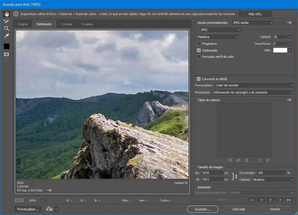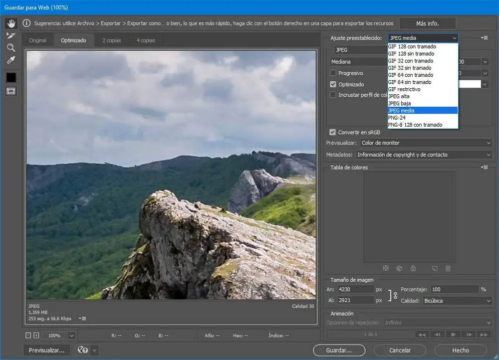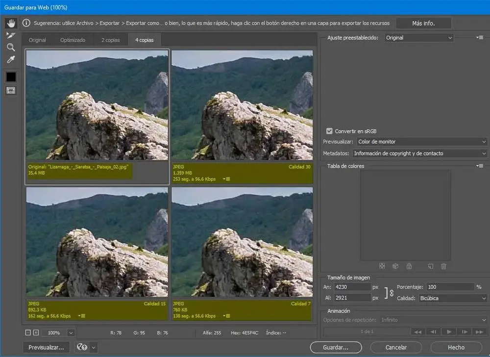 Comme nous pouvons le voir, dans cette nouvelle fenêtre, nous pourrons voir un aperçu de l’image avec la qualité qu’elle aura lors de son enregistrement (qualité approximative). Nous pourrons également effectuer plusieurs tests avec les profils, changer la qualité et les couleurs, ainsi que redimensionner l’image pour la rendre plus petite (et, accessoirement, réduire encore plus sa taille). On peut même voir un aperçu de 4 images pour comparer la qualité d’origine avec la qualité lors de l’application de différentes compressions (ainsi que la taille).