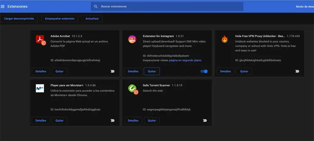 À ce moment-là, toutes les extensions que nous avons dans Chrome apparaîtront à l’écran. Tout d’abord, il est important de savoir que, pour économiser les ressources du PC , même si elles sont installées, elles ne doivent pas toutes être actives. Par conséquent, à partir de cette même fenêtre, nous vous recommandons de désactiver les accessoires que nous ne prévoyons pas d’utiliser prochainement. C’est quelque chose que nous réalisons grâce au sélecteur situé dans le coin inférieur droit de chaque élément de ceux-ci.