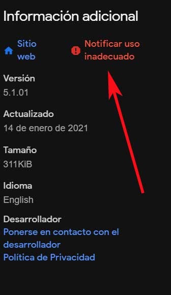Ensuite, dans la zone de recherche correspondante, nous saisissons le nom de l’élément de ce type dont nous voulons informer le moteur de recherche . Une fois que nous accédons à votre fichier, vous devez l’installer, dans la section Informations complémentaires, nous trouvons un lien direct appelé Signaler une utilisation inappropriée.