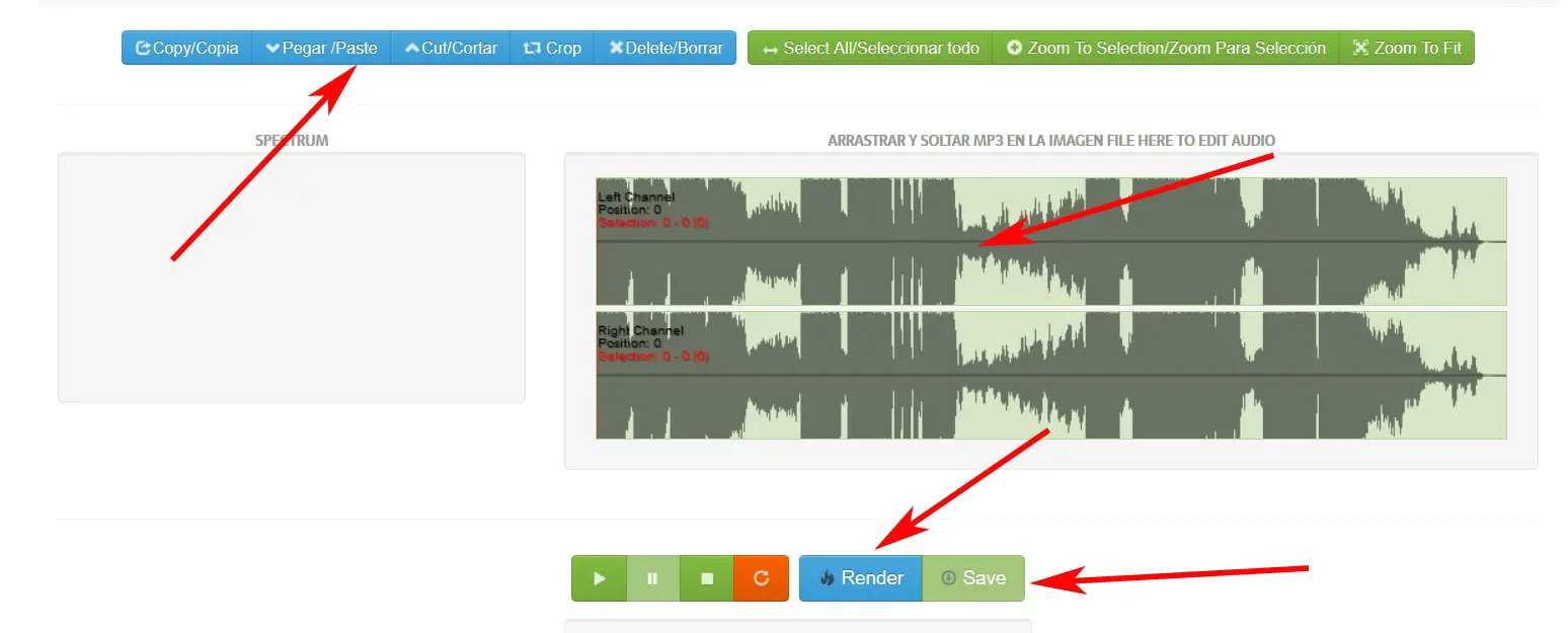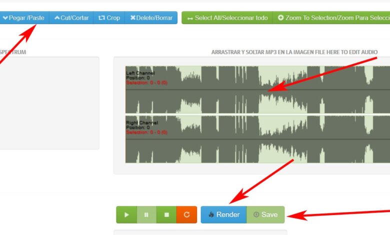 Une fois la section audio marquée, dans la partie supérieure gauche de l’interface, nous trouvons les fonctions que nous pouvons utiliser ici. De cette façon, nous trouvons des boutons pour copier, coller , couper, etc. Par conséquent, nous allons voir comment créer nos propres compositions, ou éditer le téléchargement à l’origine, c’est extrêmement simple. Nous n’aurons plus qu’à jouer avec ces fonctions , puis cliquer sur «Render», et sauvegarder le résultat depuis «Save».