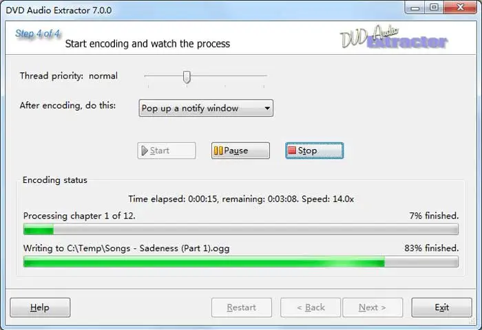 Pour terminer l’assistant et lancer le processus de conversion, il suffit d’appuyer sur le bouton «Démarrer». À partir de là, DVD Audio Extractor commencera à extraire tous les audios sélectionnés en suivant tous les paramètres précédemment sélectionnés, de sorte que nous ne pouvons qu’attendre la fin du processus. La durée de la conversion variera en fonction du nombre de pistes choisies, de la taille totale et de la puissance de notre ordinateur. En bas, nous pouvons suivre l’ensemble du processus, en nous montrant le temps écoulé, ainsi que le temps restant jusqu’à la fin de la conversion.