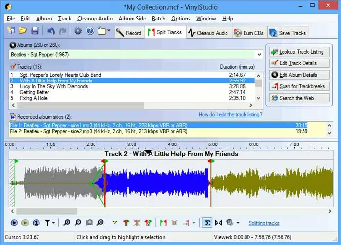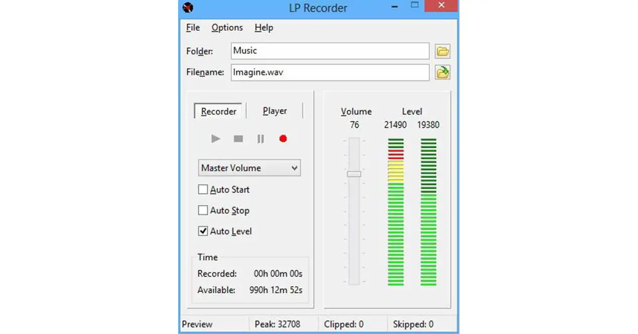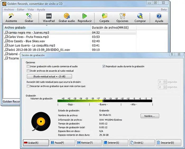 Avec ce programme, nous pourrons réaliser des enregistrements numériques de notre vinyle le plus précieux. LP Recorder se chargera d’enregistrer les fichiers au format WAV pour les convertir en MP3 ou les stocker directement sur CD. C’est aussi simple que de connecter notre appareil vinyle à la carte son, de sélectionner l’entrée d’enregistrement, de taper son nom et d’appuyer sur le bouton d’enregistrement. En plus du vinyle, il nous permet également d’enregistrer de l’audio à partir de cassettes, CD, DVD, magnétoscopes, téléviseurs, radio, MiniDisc, etc. Il dispose d’une fonction de pause d’enregistrement , qui nous permettra d’enregistrer une sélection de pistes de différents vinyles et cassettes.