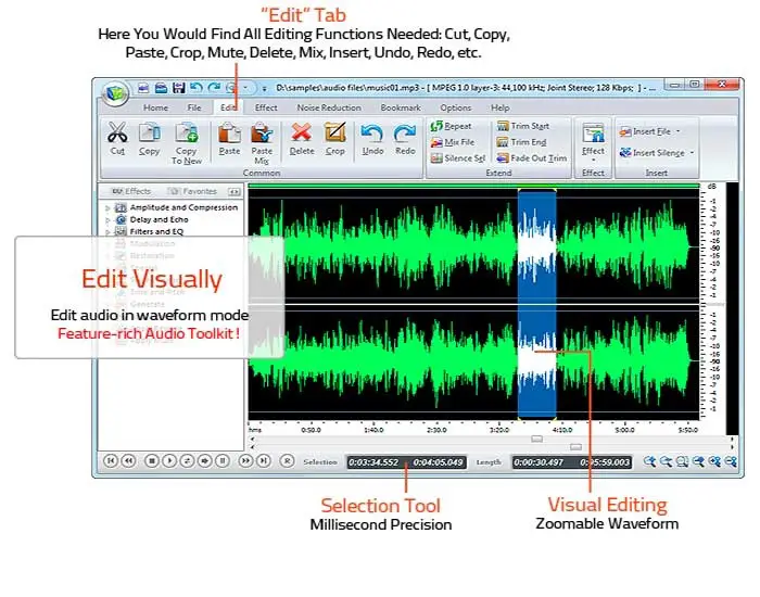 Ses fonctionnalités incluent l’enregistrement audio en temps réel, l’édition de fichiers audio tels que MP3 ou WAV, il prend en charge la conversion entre différents formats audio, ainsi que la possibilité d’éditer plusieurs pistes audio. Il permet également l’importation de fichiers au format MP3, RAW et MIDI, ainsi que la possibilité d’ajouter des effets au son tels que l’écho, l’inversion, la tonalité, etc.