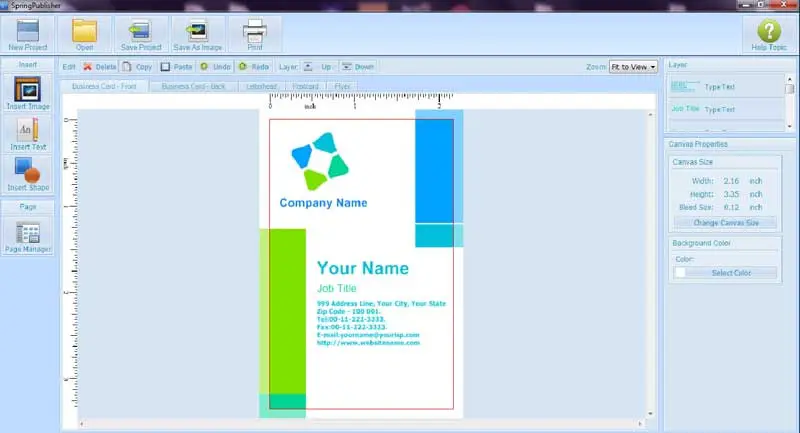SpringPublisher est un outil avec lequel nous pourrons créer toutes sortes de cartes de visite, cartes de visite et cartes postales, ainsi que des brochures, des en-têtes et des lettres. Nous pouvons créer nos œuvres avec une résolution maximale de 350 DPI . De plus, nous pouvons créer toutes sortes de documents avec des logos, du texte, des images vectorielles, etc. Il intègre également un éditeur multicouche, ainsi que des effets et des outils d’édition.