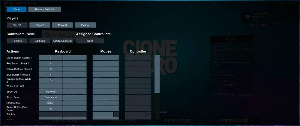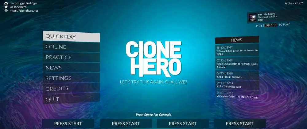 L’utilisation du jeu est simple. Dans le menu principal, nous allons trouver les différents modes que Clone Hero nous propose. QuickPlay nous permet de commencer une chanson rapide, la lecture en ligne via Internet et la pratique ouvrent les modes d’entraînement pour commencer à répéter avec la guitare, voir que tout fonctionne et l’ajuster au maximum.