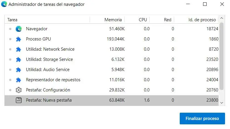 À ce moment, une nouvelle fenêtre apparaîtra sur l’écran à partir de laquelle nous pouvons voir de première main tous les processus qui fonctionnent dans Edge. De cette façon, nous pouvons vérifier quels éléments consomment le plus de ressources à ce moment. Nous les verrons en détail dans cette fenêtre, ainsi que la RAM, le processeur et le réseau que chacun consomme. Ces processus sont identifiés par un numéro de processus et nous pouvons fermer celui que nous voulons.
