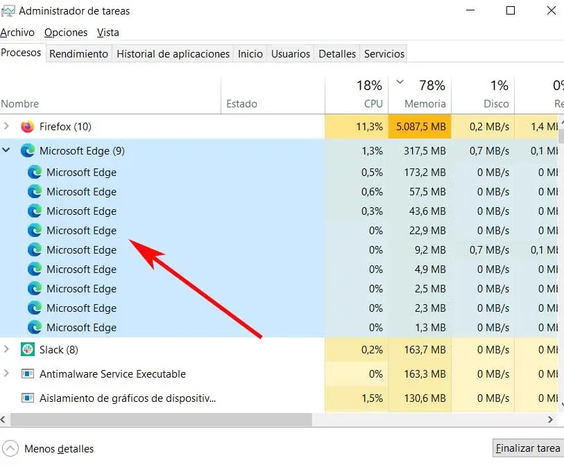 L’une des premières étapes que nous pouvons prendre pour savoir ce qui se passe réellement avec la consommation de ressources d’Edge consiste à accéder au gestionnaire de tâches Windows. Pour ouvrir cet élément important du système d’exploitation, nous pouvons utiliser la combinaison de touches Ctrl + Maj + Echap. Ensuite, nous allons dans l’ onglet processus de cette section et cliquez sur l’en-tête de la mémoire.