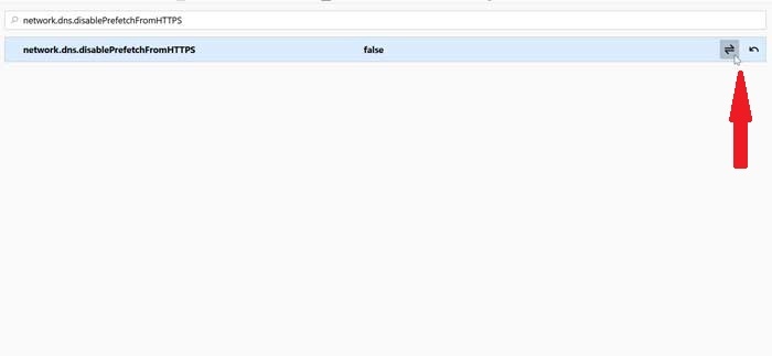 Maintenant, dans la barre de recherche, nous devons copier «network.dns.disablePrefetchFromHTTPS» . Une barre devrait apparaître juste en dessous qui dit «vrai» et que nous devons changer en cliquant sur le logo «Toggle» situé sur le côté droit et nous verrons comment cela change en «faux».
