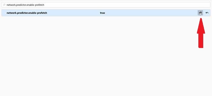 Maintenant, dans la même barre, nous devons copier «network.predictor.enable-prefetch» . Dans ce cas, la barre ci-dessous indique «faux». Cliquez à nouveau sur le logo «Toggle» pour qu’il devienne «true».
